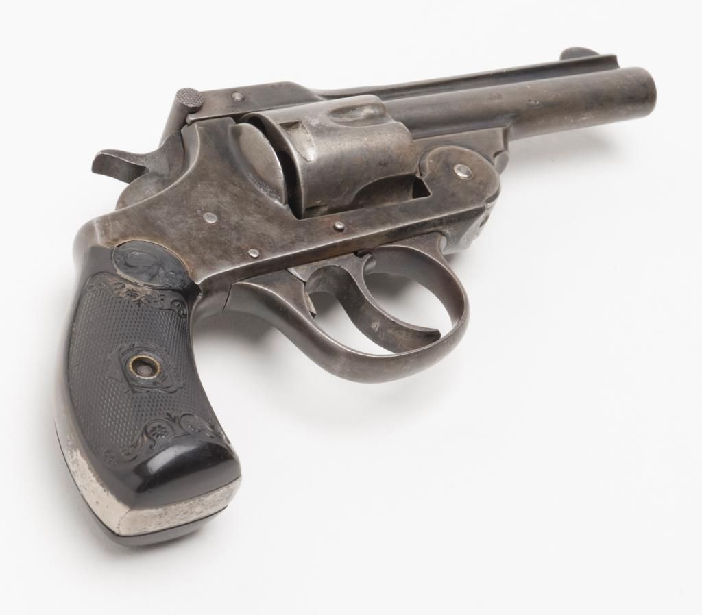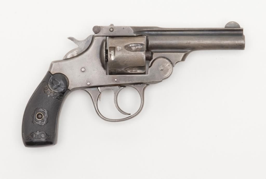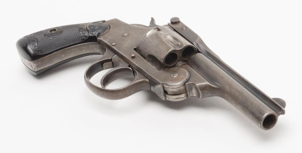 Iver Johnson Top Break revolver, .38 caliber, Serial #G6091. The pistol is in overall good condition with a 3 ¼” barrel. The pistol retains small amounts of its blued finish in protected areas with the remainder going to a gray patina.The checkered hard rubber grips are in only fair condition with the right panel showing damage at the top. The bore is good, however the action is in need of adjustment. (C+R/PPT). Est.: $75-$150.
