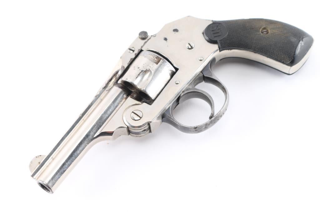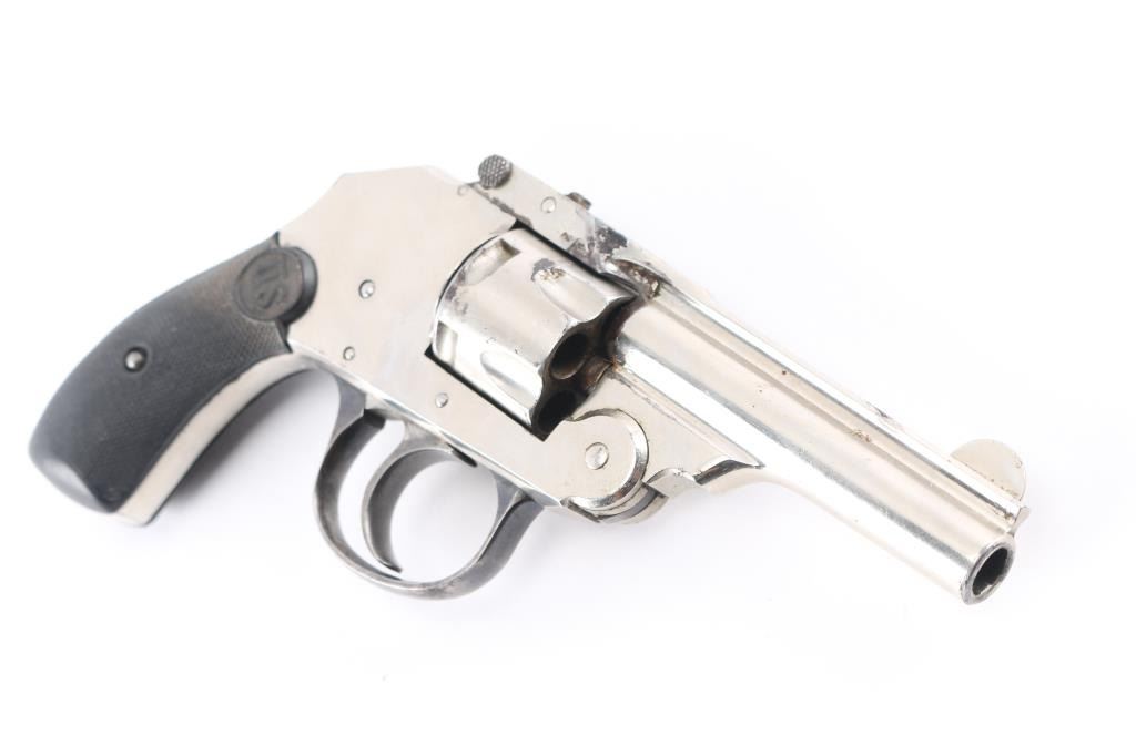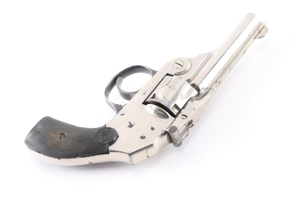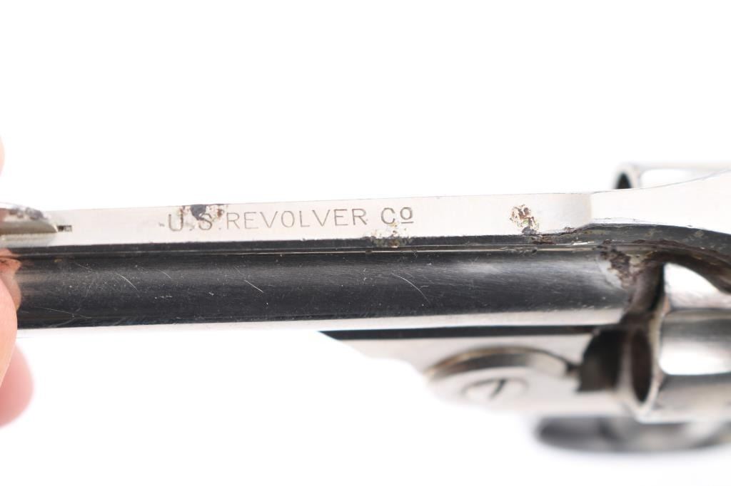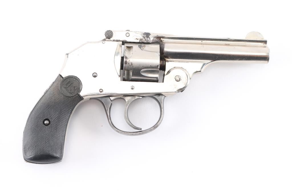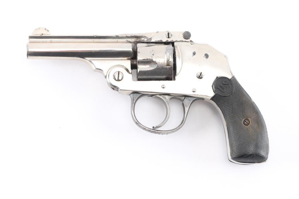 Sn: 26913. Trade name double action revolver manufactured by Iver Johnson circa 1910-1935. Safety Automatic Hammerless, D/A only. Features nickel finish, checkered black hard rubber grips with "U.S." motifs, 3" barrel, fixed sights, 5 shot fluted cylinder. Bore is good/bright with some small areas of very light pitting, visible rifling. Nickel finish is good condition, showing a little peeling and flaking on edges,. Triggerguard is blued, fair condition with losses, grips are very good.