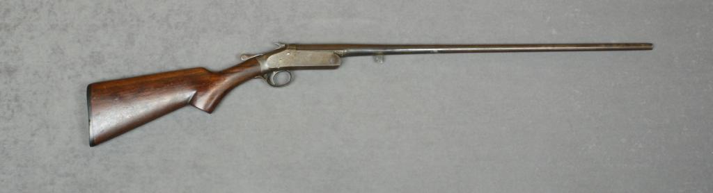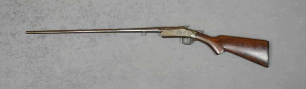 Iver-Johnson single shot tip-up shotgun, .410 gauge, 28” barrel, blue and case hardened , wood butt stock (missing fore stock, #90846B. This gun is a project gun with traces of blue on the barrel and traces of case coloron the receiver; bore may clean to better than fair as it is very dirty; action is good; wood stock is overall good with a crack at the front of the semi-pistol grip; correct black hard rubber Owl’s Head buttplate. Est.: $25-$50.