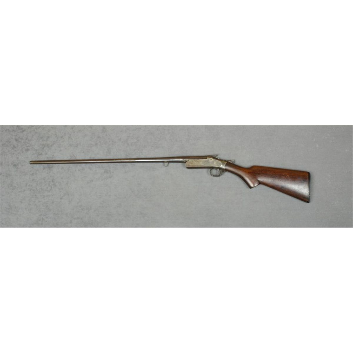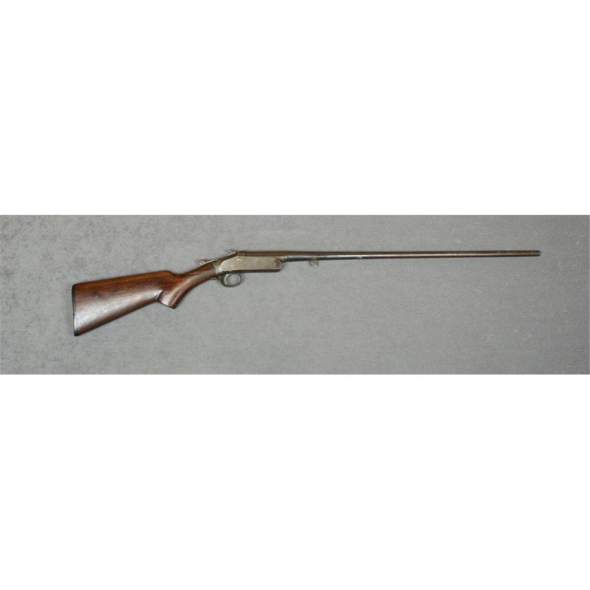 Iver-Johnson single shot tip-up shotgun, .410 gauge, 28” barrel, blue and case hardened , wood butt stock (missing fore stock, #90846B. This gun is a project gun with traces of blue on the barrel and traces of case coloron the receiver; bore may clean to better than fair as it is very dirty; action is good; wood stock is overall good with a crack at the front of the semi-pistol grip; correct black hard rubber Owl’s Head buttplate. Est.: $25-$50.