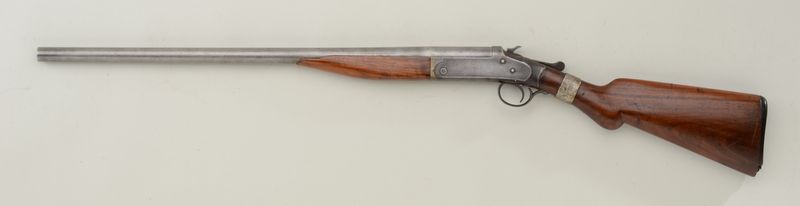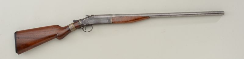Iver Johnson single shot tip up shotgun, #NSNV, 12 gauge, 26" barrel with walnut stock and hard rubber butt plate. Shotgun is in fair to good condition overall, showing traces of original finish, stock has an oldrepair at the wrist, with a 1" metal band approximately 1/16" thick which obscures a serial number beginning with 8. Wood shows an old coat of varnish, rubber butt pad is missing a 3/4" x 3/4" piece at the toe. Bore is good, and should improve with cleaning, action is good. Est. $75-150.