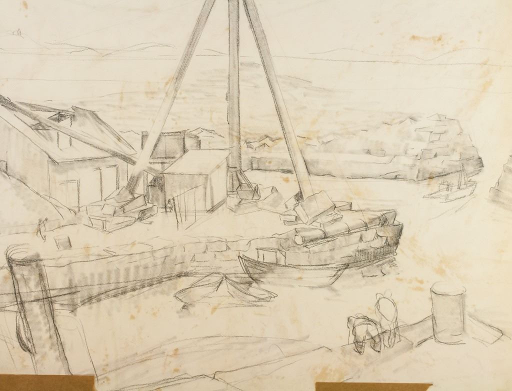 Mixed media on paper. Featuring a portrait of a couple strolling alongside path. Signed Iver Rose on the lower left corner. Other side with sketch of landscape scene. 54 x 78 cm (21 x 30.75 inches). Attributed to Iver Rose (1899-1972, American). PROVENANCE: Private American collection (Massachusetts)