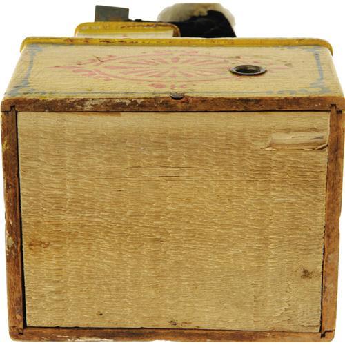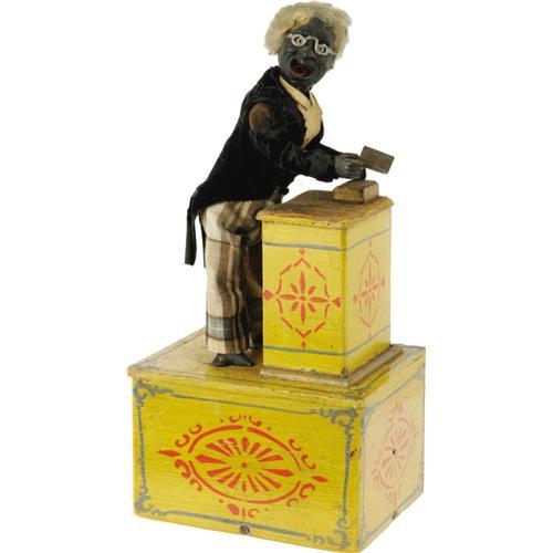<B>Preacher 11" Clockwork Toy by Ives.</B></I> Although better known for their line of toy trains, Ives also made these clockwork-powered dolls. Designed and made with the attributes of famous notables of the 1870s and 1880s, these toys could move when wound. Here we offer the Black Preacher, who stands at lectern with book and paper giving his sermon. Nicely decorated and appointed, the base is original yellow paint. When wound, the preacher moves back and forth shaking his fist. Although the clothing is somewhat tattered due to age and storage, it does appear to be original as well as the wig on his head. The bottom board closing in the works has been replaced with a new piece that cannot be seen when set up for display. Hard to find in this type of condition, the preacher has an exceptional folk-art look and has become one of the many desirable toys made by this early company.