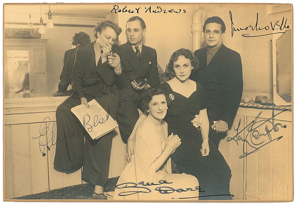 Vintage matte-finish 10 x 6.75 photo of a group of classic actors and actresses, signed in blue fountain pen by all pictured: Ivor Novello, Edna Best, Fay Compton, Robert Andrews, and Zena Dare. Blindstamped in the lower right by Jaye & King of Brighton. In fine condition.