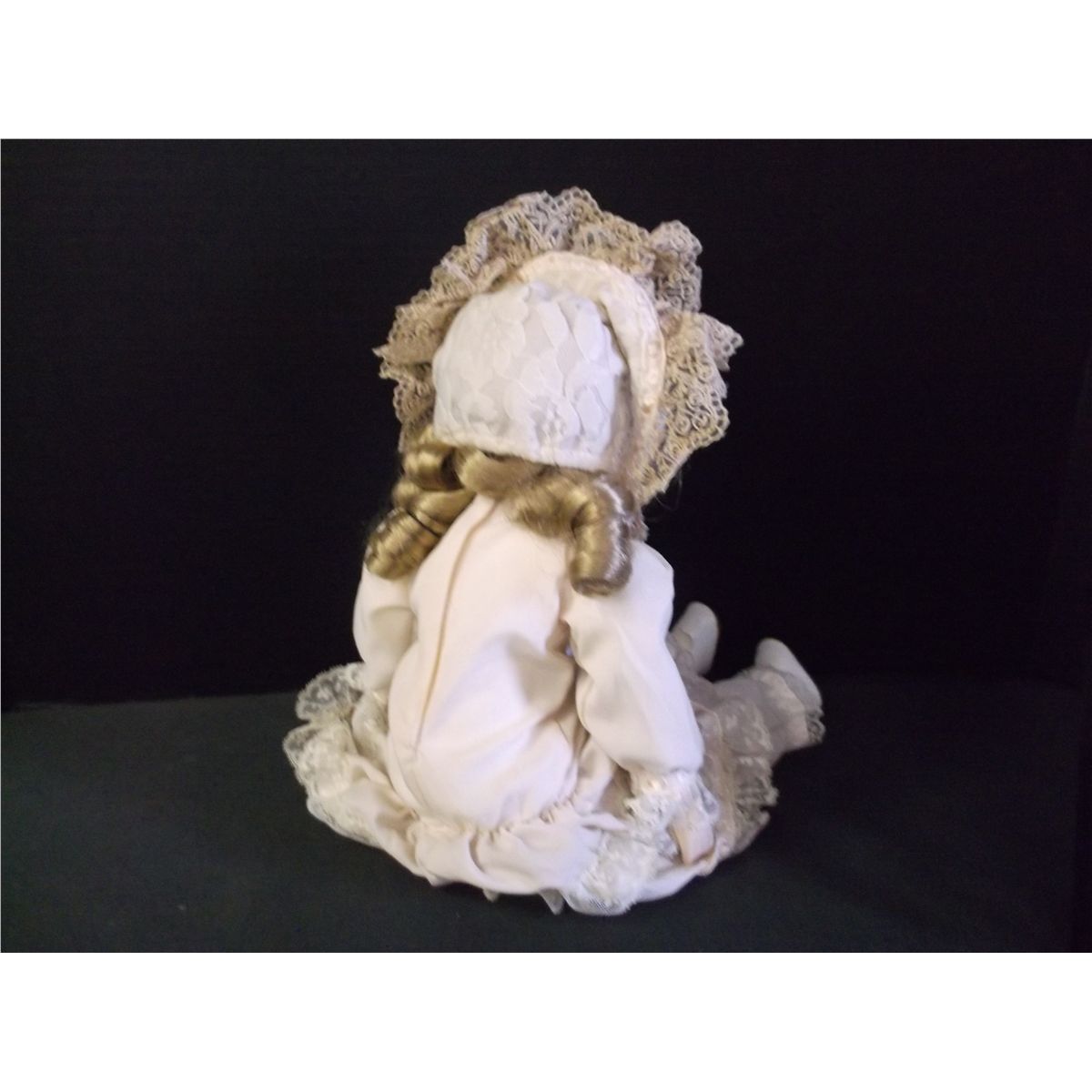 Description: Doll, hand painted face, wearing bonnet with embroider on it. Colored ivory dress with tights and white vinyl shoes. Dress has embroider in middle and trimmed with lace on the edges.Dimensions: 18 1/2"Medium: Porcelain, glass eyes.