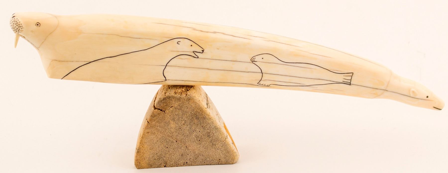 It is titled "Coral Harbor" and the artist is Kotsiark. Almost a foot long carved ivory. Has a carved walrus head on one end with two ivory tusks and a carved polar bear head on the other. Etchings of a polar bear and seal on one side and two different whales on the other. This would look magnificent in any collection. (Coral Harbour is a small Inuit community that is located on Southampton Island, Kivalliq Region, in the Canadian territory of Nunavut. Its name is derived from the fossilized coral that can be found around the waters of the community which is situated at the head of South Bay.)
