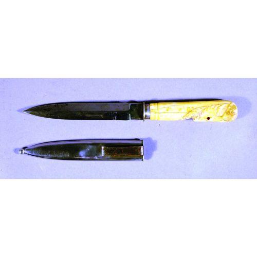 Ivory Bowie Knife Handle with Elk Head and ruby eyes, comes with metal sheath. Piece of the elks antler is broken off and considerable discoloration to the blade otherwise good condition. 9 inches long.