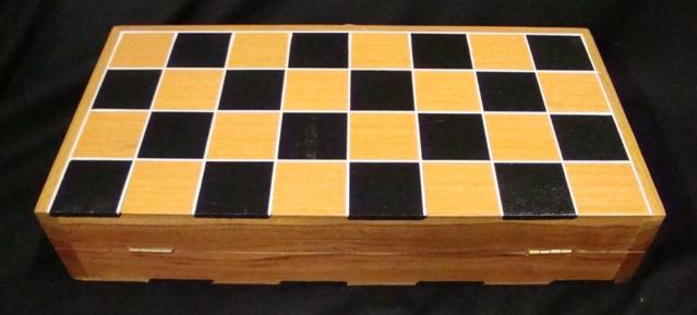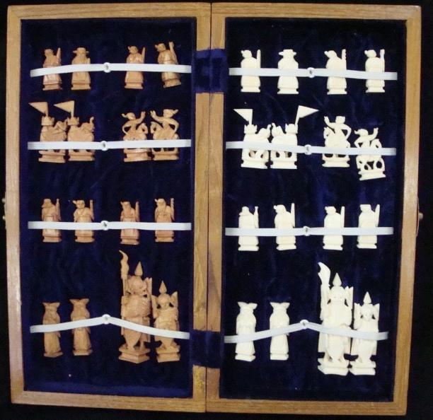 Oriental carved ivory chess set with case that folds out into the board. Standard size board. King pieces are about 3" tall.