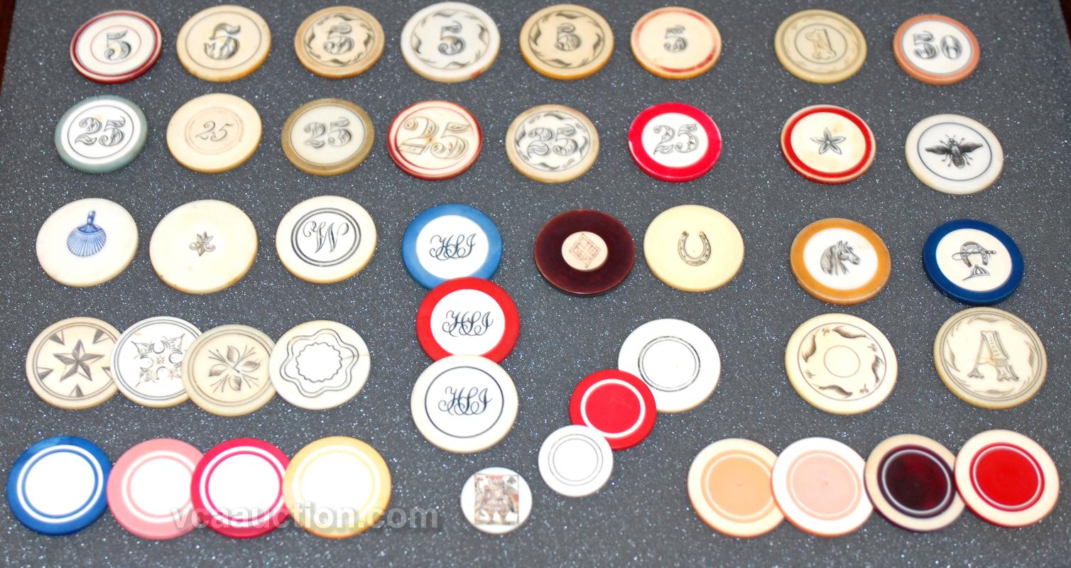 Ivory Chip Collection - 44 chips: $1, $5 and $25 denominations, fan, horseshoe, initials, and more; showcased in a glass covered display box.