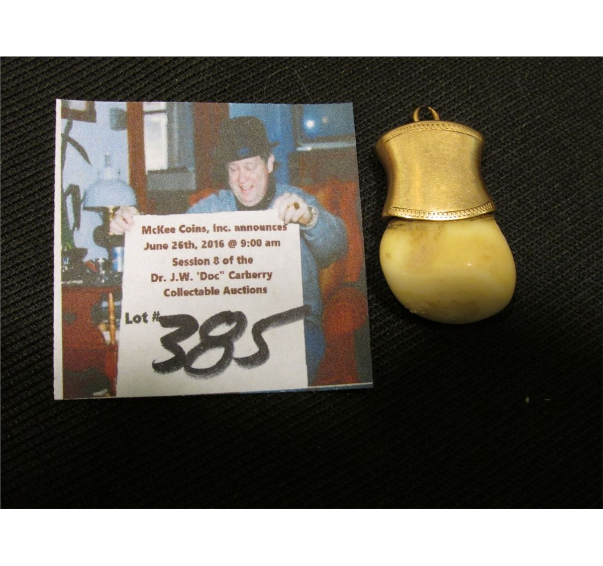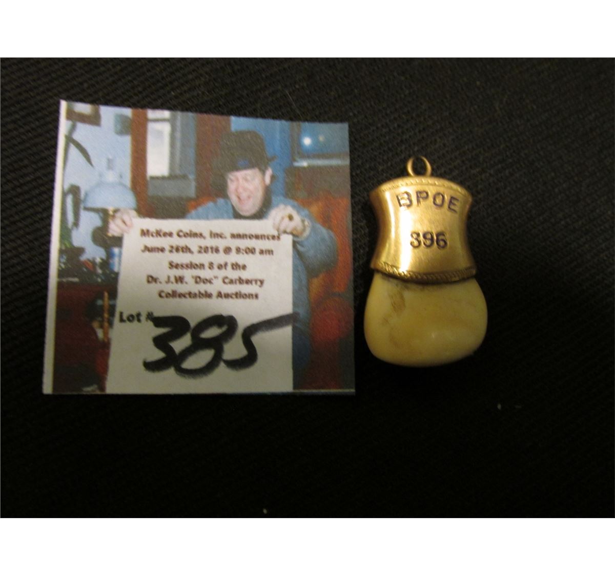 Ivory Elk's Tooth "BPOE 396" mounted in a Gold mount for suspending from a necklace.
