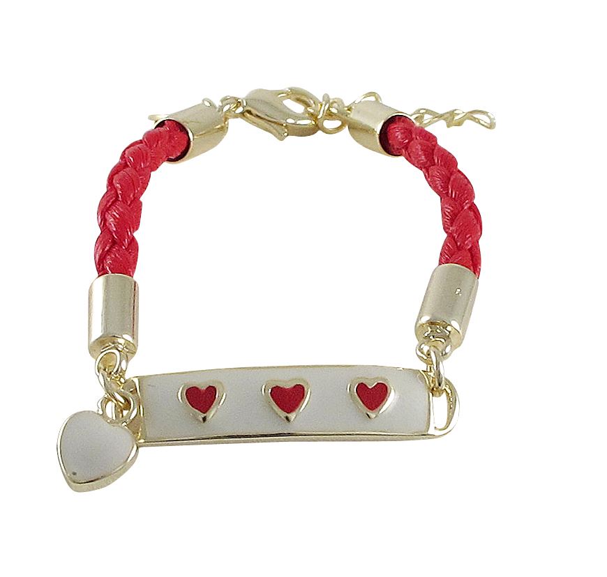 Ivory Enamel Bar With Red Hearts On Red Cord, Gold Plated Brass Bracelet, 5" 1"