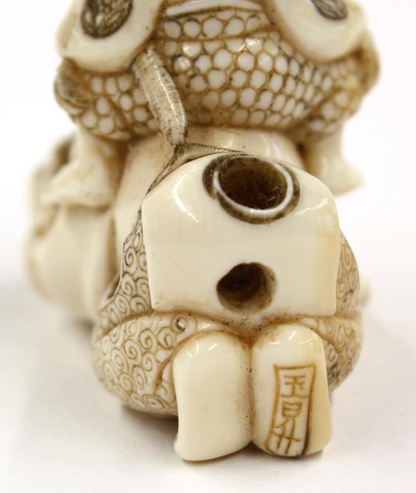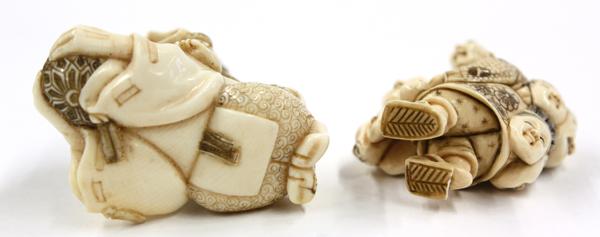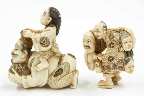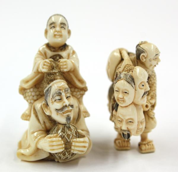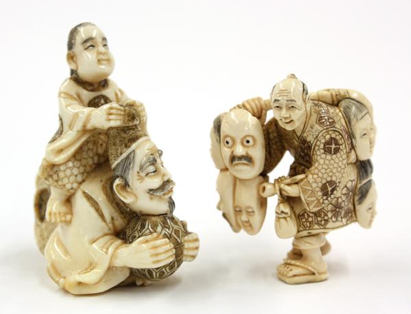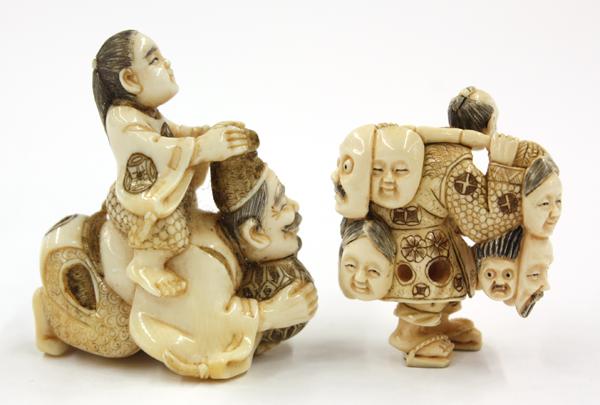 (Lot of 2) Ivory figural netsuke, Meiji/early Showa period, each with the incised details heightened with brown and black pigment, one of a vendor of masks, unsigned, 1.6''; the other depicting a youth riding on the back of a Japanese courtier with a tall court cap and holding a brocade ball to the front, signed Gyokusho, 2''h