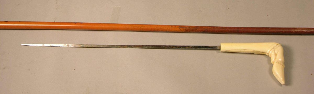 Ivory Handled Dagger Ladies Cane. Removable dagger handle and light wood shaft. Missing the tip otherwise very good condition. 34 3/4 inches.