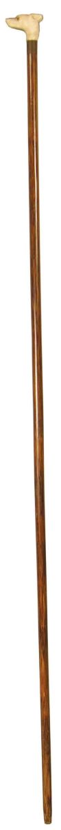 Ivory Handled Ladies Cane. Ivory carved dog with glass eyes, metal bezel and wood shaft. Missing tip otherwise very good condition. 34 1/2 inches.