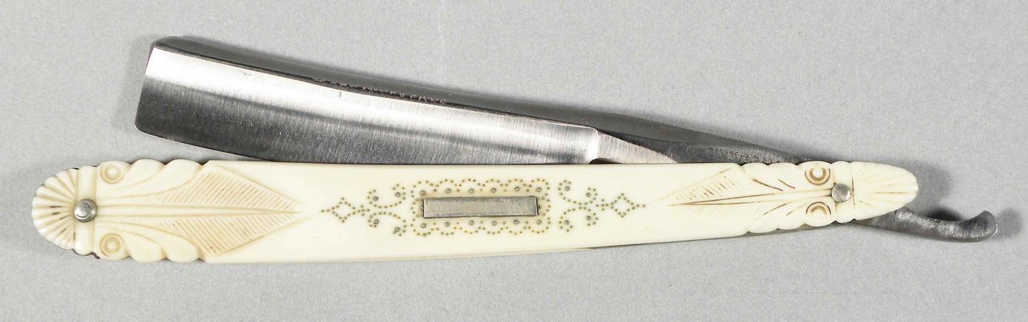 Highly Carved Ivory Straight Razor. Universally approved. Silver inlay with key. Excellent condition. Starting bid $70