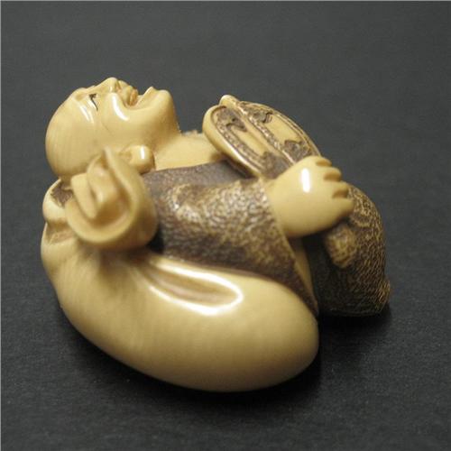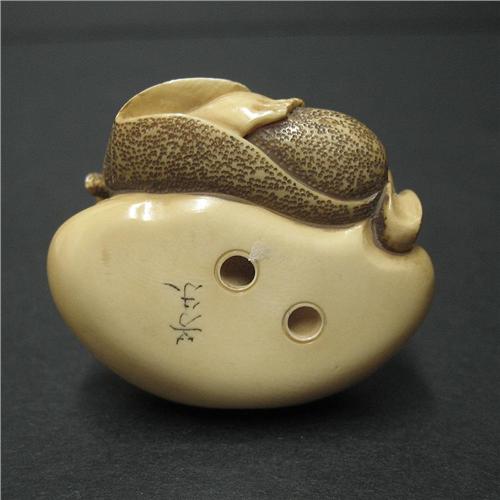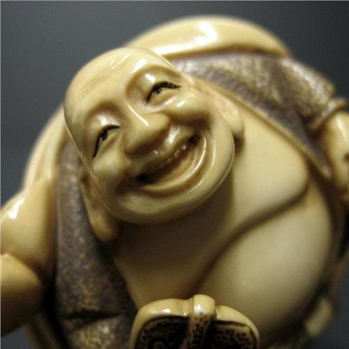 Ivory Japanese netsuke depicting the Buddhist monk Hotei; round form; artist signed; early 19th C.; 1 1/2" high x 2" across; no visible defects