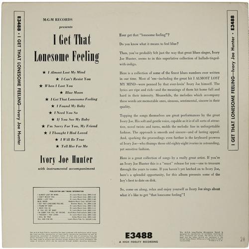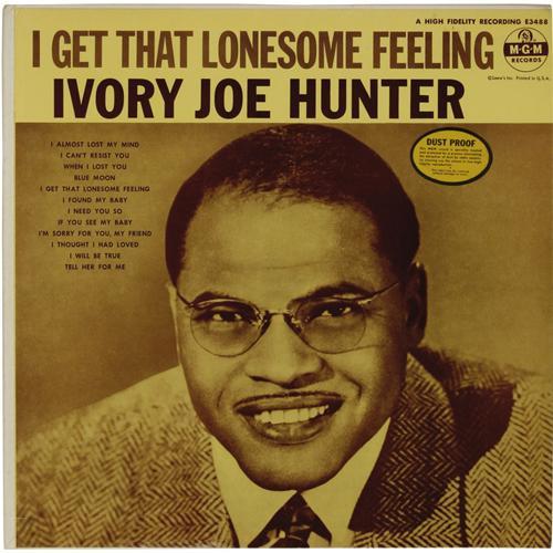 <B>Ivory Joe Hunter "I Get That Lonesome Feeling" LP MGM 3488 (1957).</B></I> The smooth soulster had been enjoying Top Ten success on the R&B charts since 1945, but this, his first album wasn't released until 12 years later. Included are two of his #1 R&B smashes, "I Almost Lost My Mind" and "I Need You So". Condition: NM 8/ NM 8. <I>From the GRT Collection</B></I>.