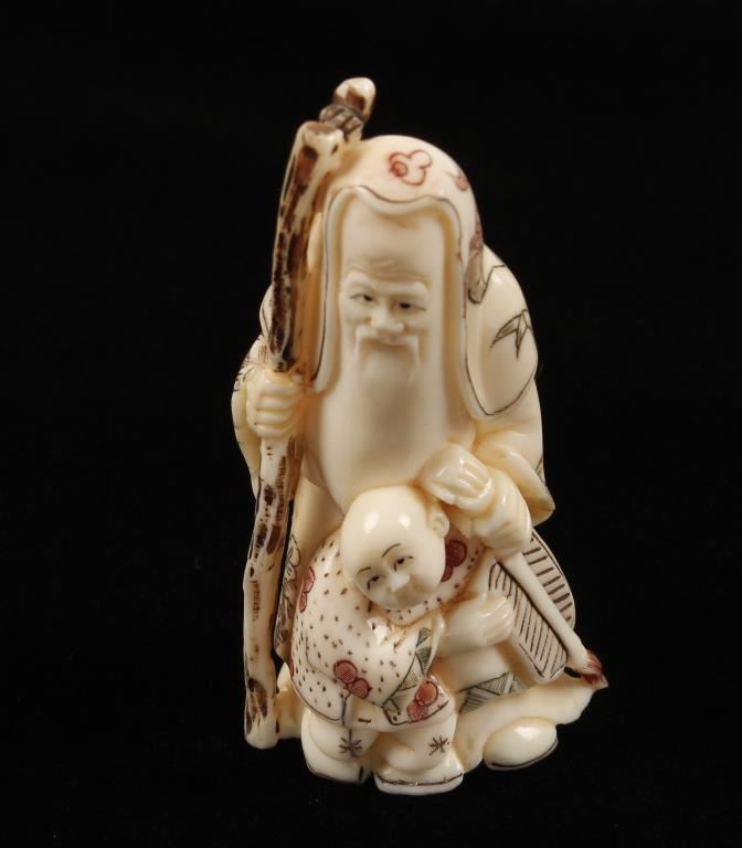 God of Longevity, generally depicted in sculptures as an old man with a long white beard, holding a staff that has a scroll or a book attached. Jurojin is a member of Japan's Seven lucky Gods. Finely carved to depict a bearded elder holding staff with a child holding a fan at his feet. A netsuke is a small toggle, often in the form of a carved ivory or wood figure, used to secure a purse or container suspended on a cord from the sash of a kimono. Measures 2 3/4" high. Artist's signature in red rectangle underneath by the feet. Can only be sold in the state of Arizona.