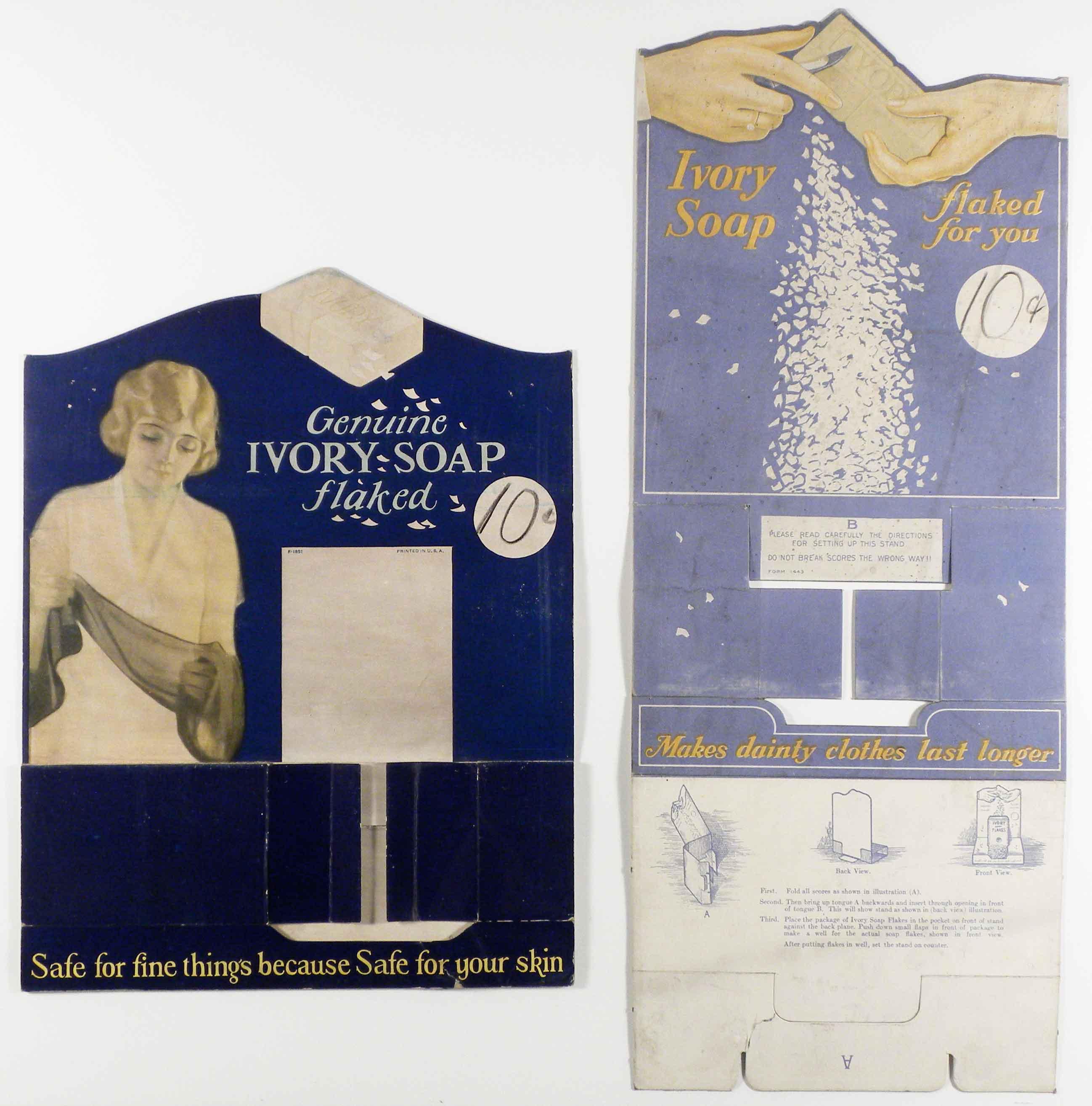 Ivory Soap Folding Cardboard Product Displays, die cut. Both have hand written prices, tear and scuff on small display and large display is faded and tear at 7:00. Large one measures 9 X 22 1/4 inches.