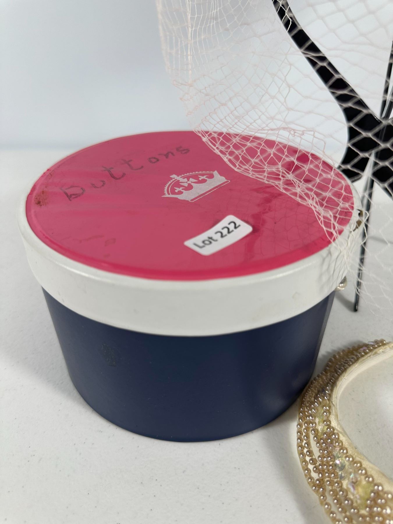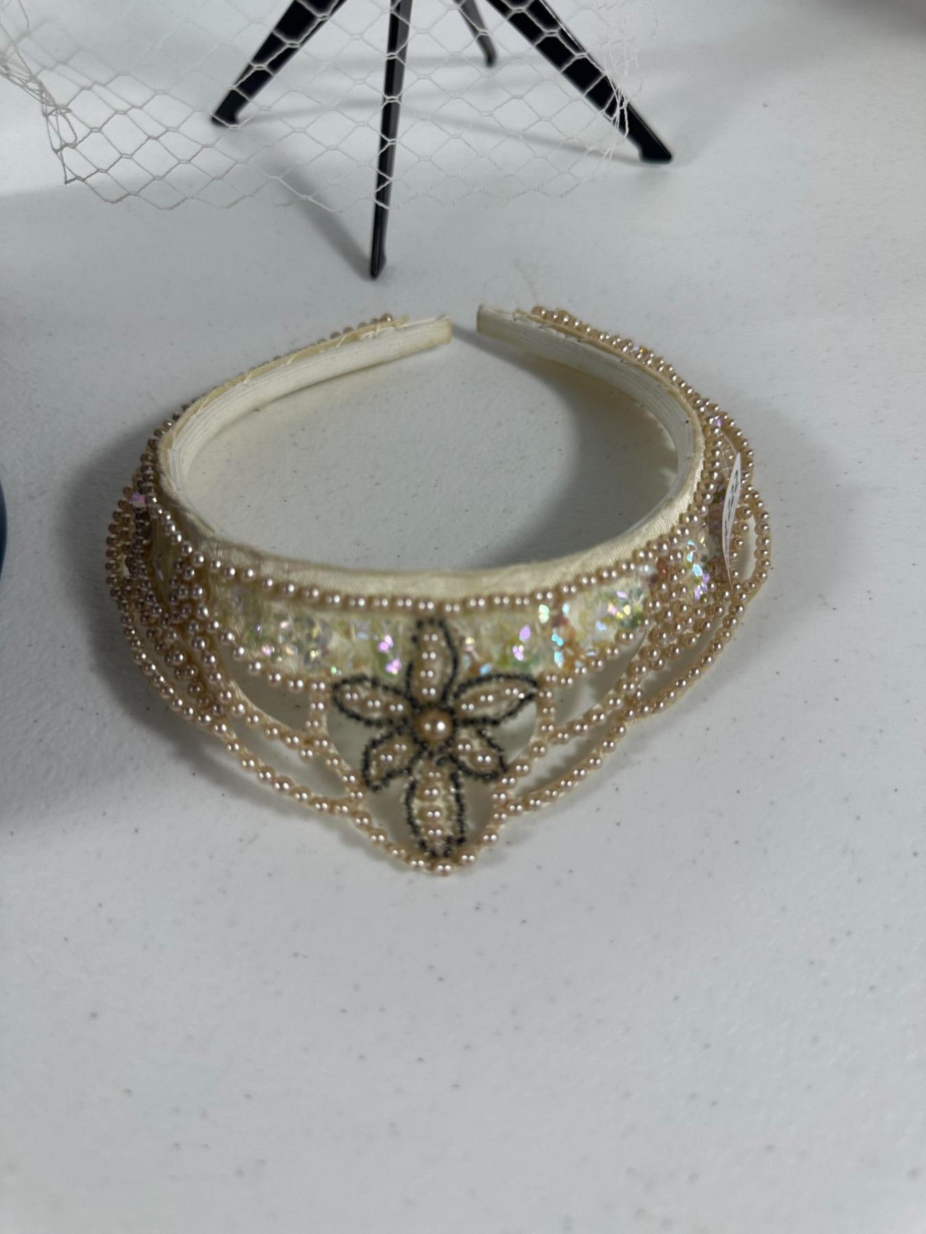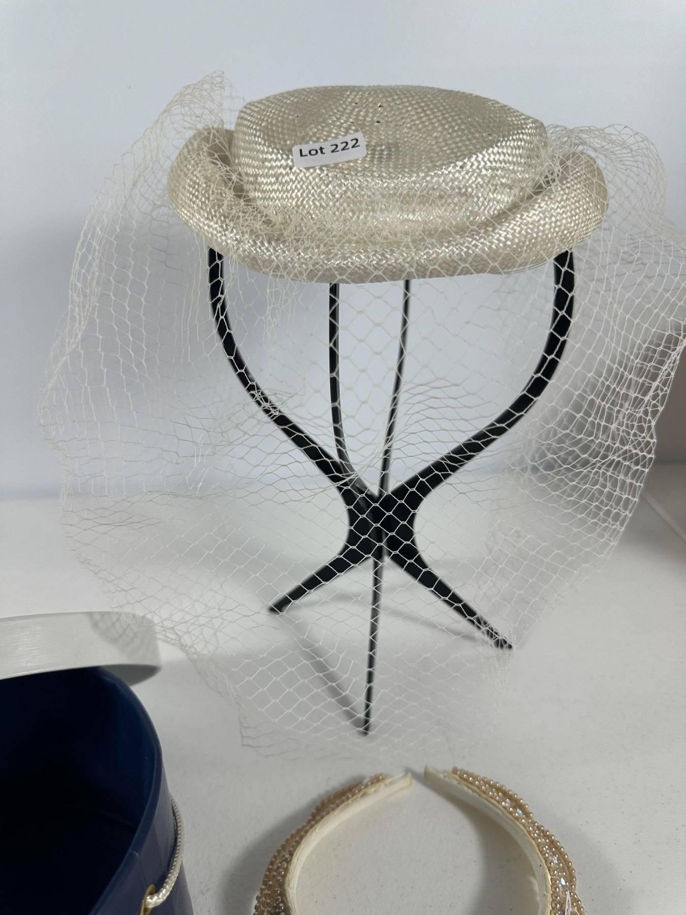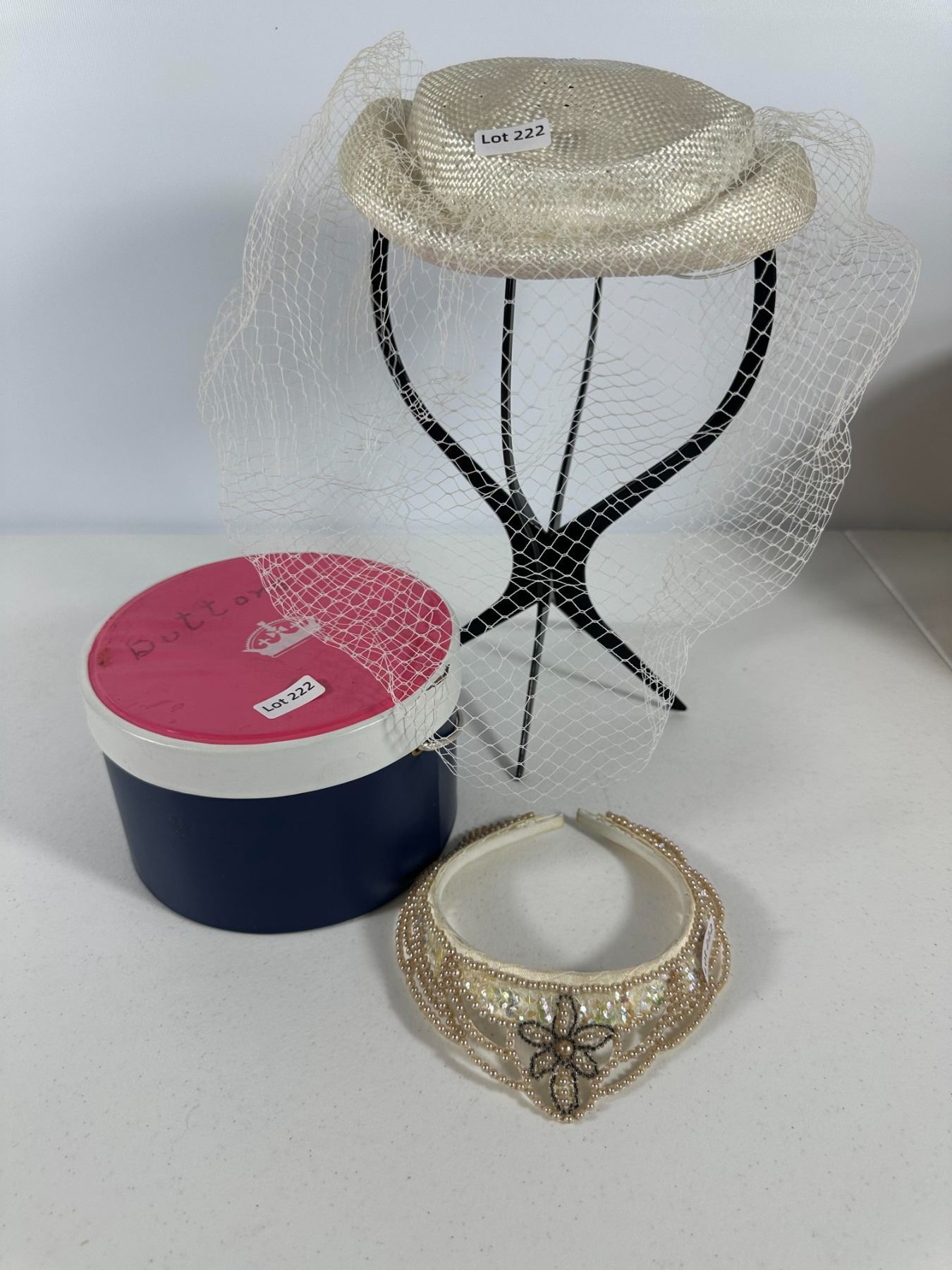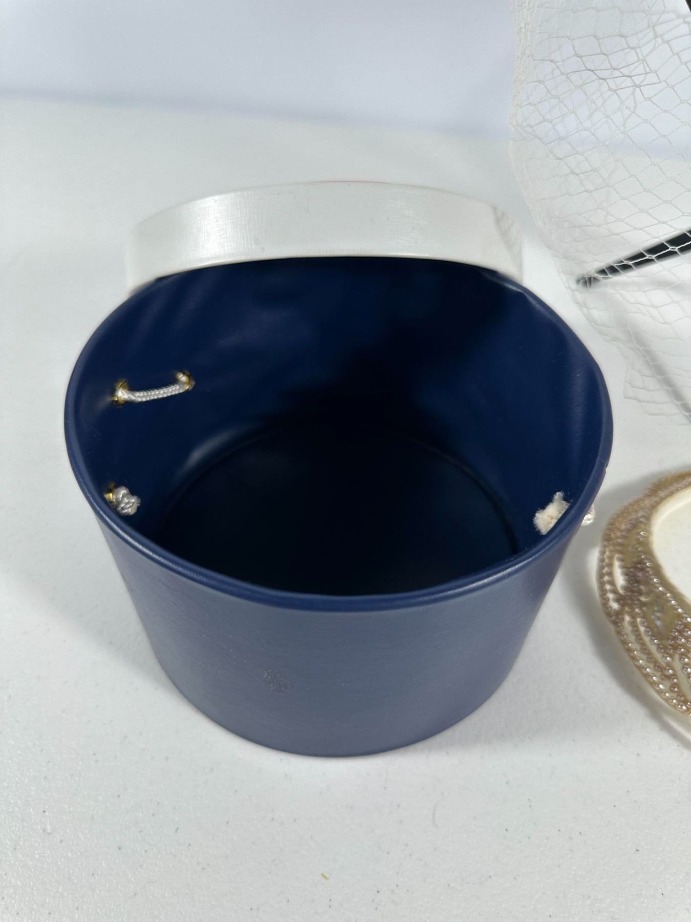 Petite woven saucer hat with sweeping net veil; paired with a pearl‑and‑sequin beaded collar. Comes with a round ‘Bata’ hat box (not original).