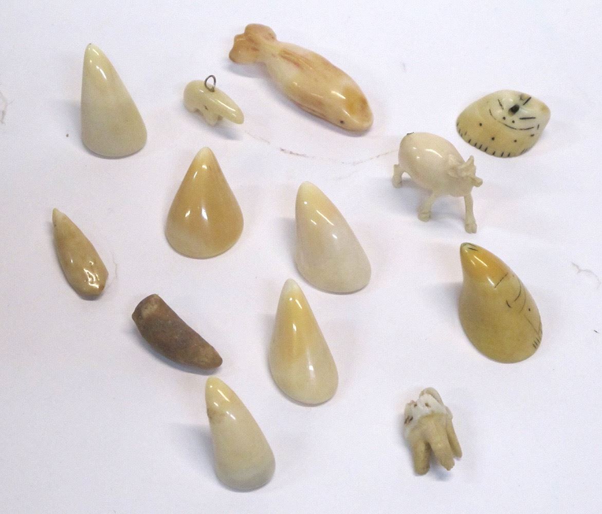 Seven ivory walrus teeth and four fetishes--whale, bear, cow and unidentifiable piece. Date: Location: Alaska HWAC # 54877