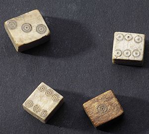 Ivory and bone. Four roman bone dice. Roman imperial. D/ Three dice with incised dotted rings on each facet numbering 1 to 6. One is loaded. Carved bone. 1 cm wide max.