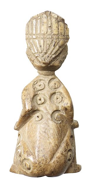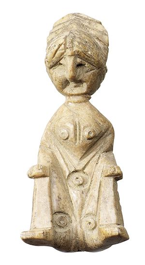 Ivory and bone. Woman-shaped bone dice. Roman imperial. D/ The female figure is crouched. She has incised dotted rings over all body. Numbers from 1 to 6, 4 is missing. Carved bone. 3.6 cm high.