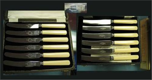 Ivory handled knives in original presentation cases. Knife blades are marked Elkington & Co. Stainless England and in total measure 7 1/4"