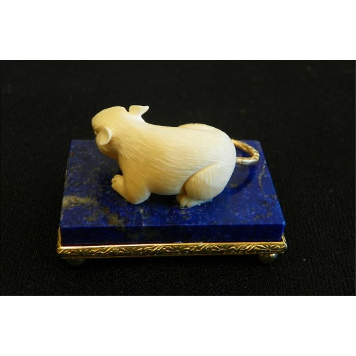 Yellow gold. Sitting on lapis base with silver  bezel with gold overlay. Please read our terms of sale.