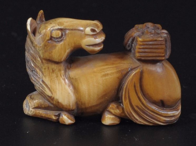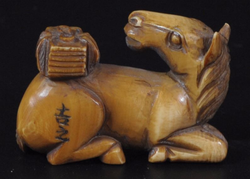 Ivory netsuke, sitting horse with load on his back, slight flaw in one of the ears, signed, length: 4.5 cm.