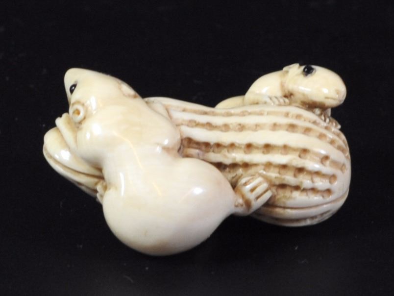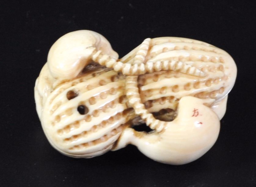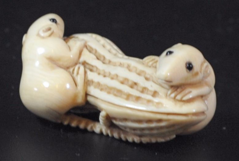 Ivory netsuke, mice on a cornob, signed, length: 4 cm.