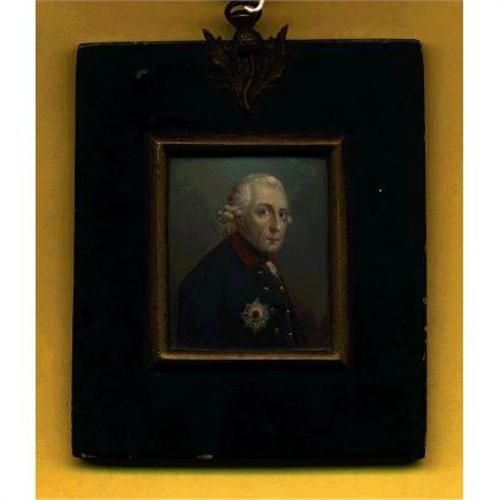 Ivory of an Officer. Hand-painted portrait by artist Smith, probably English, c. 1800. Blue coat with large jeweled decoration, red collar. Nearly square image 2 1/8 x 2 1/2 , set in narrow gold frame 4 x 4 3/4 , black mount. Under glass. Colorful and fine.