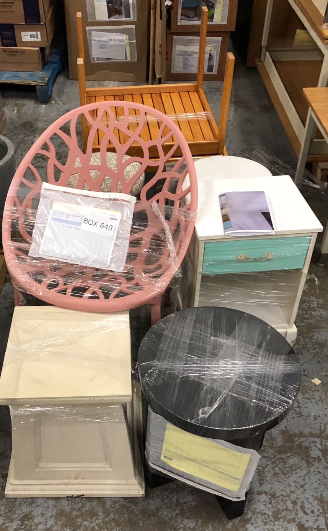 "Ivy + Bean Movie" - Large group of assorted furniture - include plastic pink chair, two stools, two side tables, side tables etc.