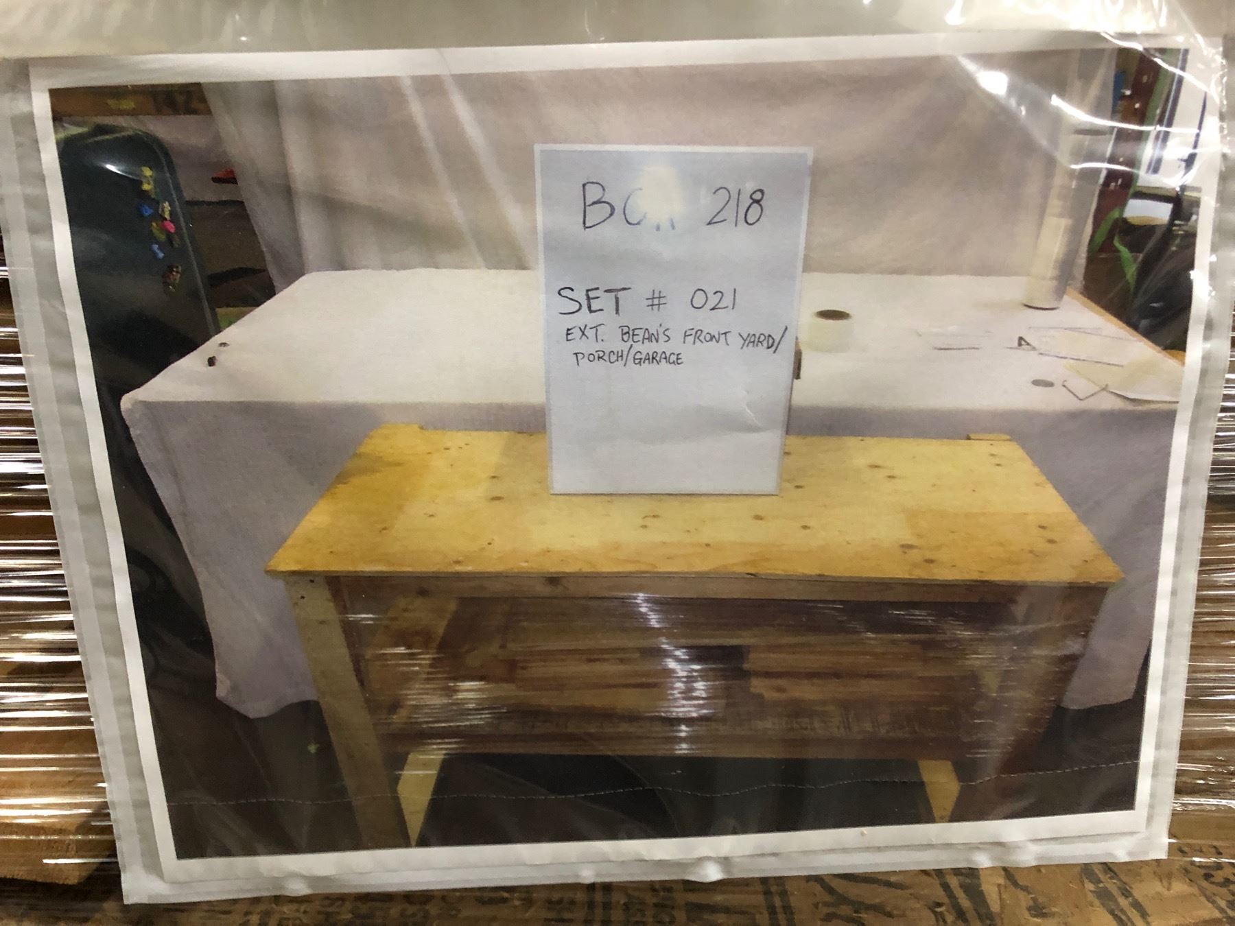 "Ivy + Bean Movie" Wooden work table with wood supply shelf brackets, small wood shelf and bar stool