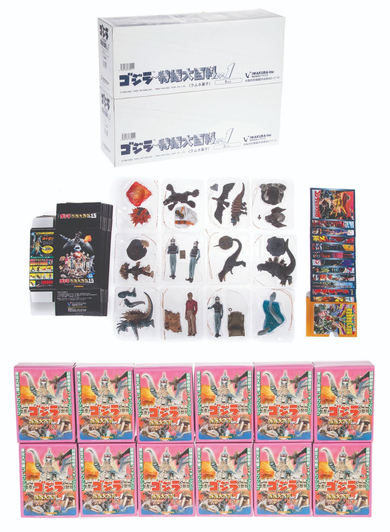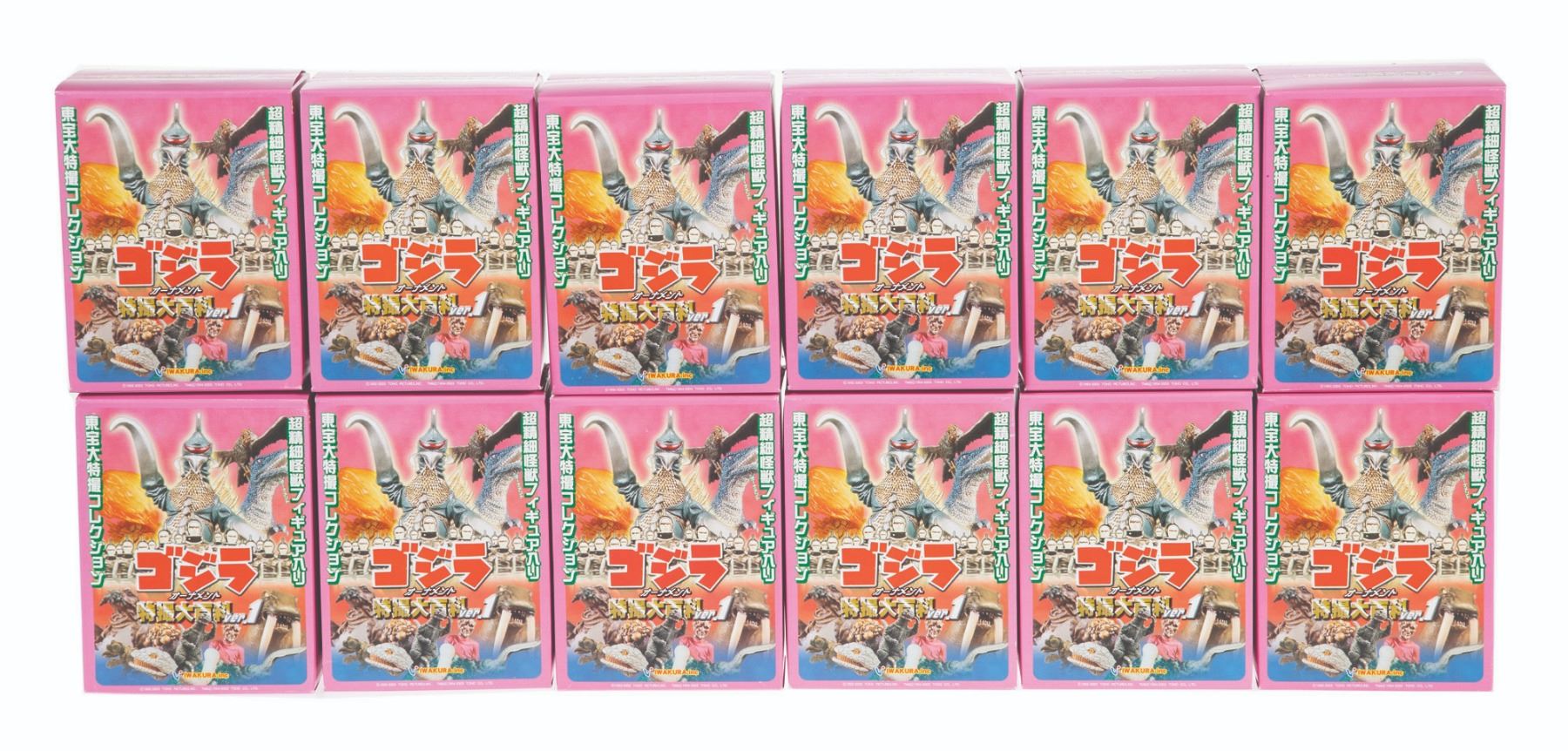2003. Iwakura Godzilla Version 1 Set of 12, Clear Version set of 12, Version 1. 5 w/ boxes & POS Boxes, set of 12. Figures: 3. 5”. VG+.