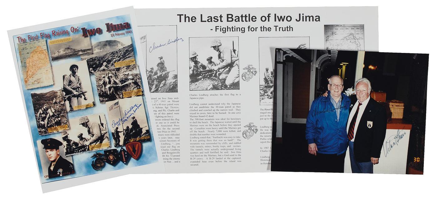 Three items: color satin-finish 10 x 8 photo of Lindberg and World War II Ace Urban L. Drew in their later years, signed in black felt tip by both men; 8.5 x 11 laser print copy of a photo montage showing the flag-raising on Iwo Jima, signed in blue felt tip, “Charles W. Lindbergh, 1st Flag raiser, Iwo Jima”; and a 17 x 11 Iwo Jima fact print signed in blue felt tip by Lindbergh. In overall fine condition.