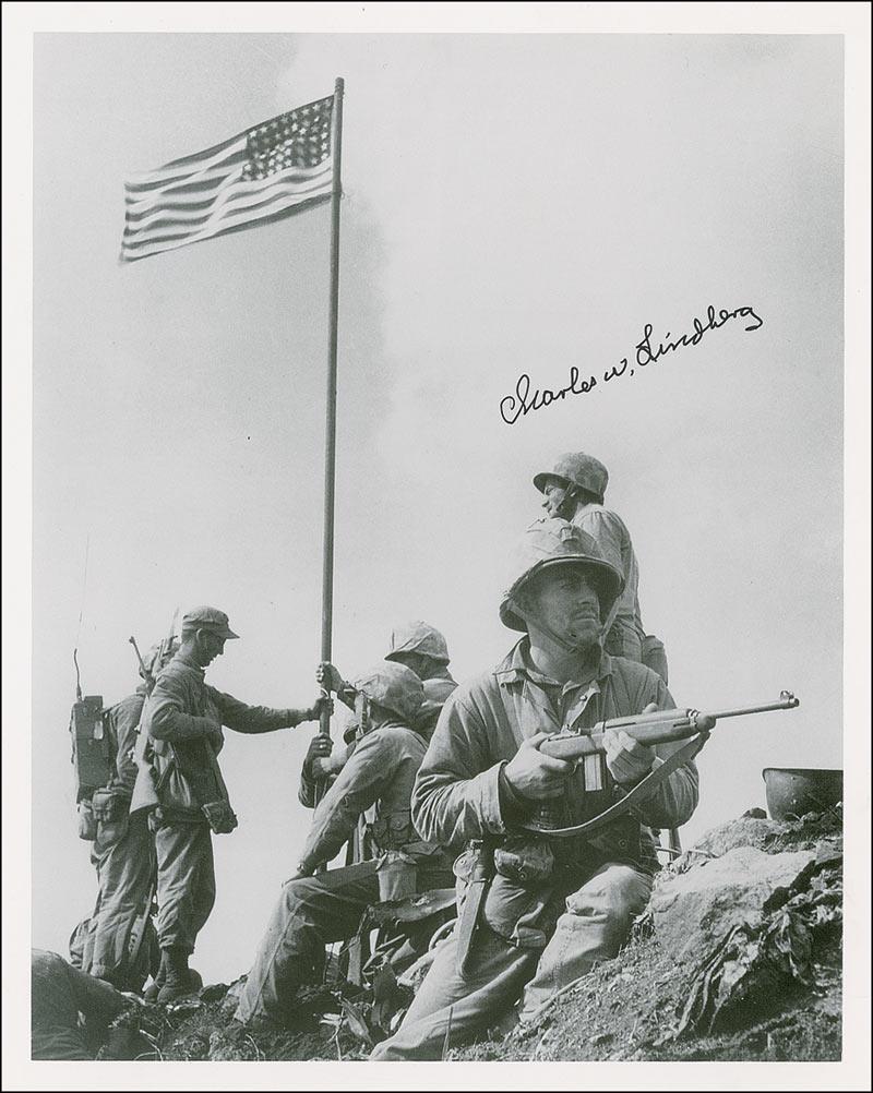 Cardstock 8 x 10 photo of the historic first flag-raising on Iwo Jima, signed in black felt tip, “Charles W. Lindberg.” In fine condition, with slight bend to upper right corner.
