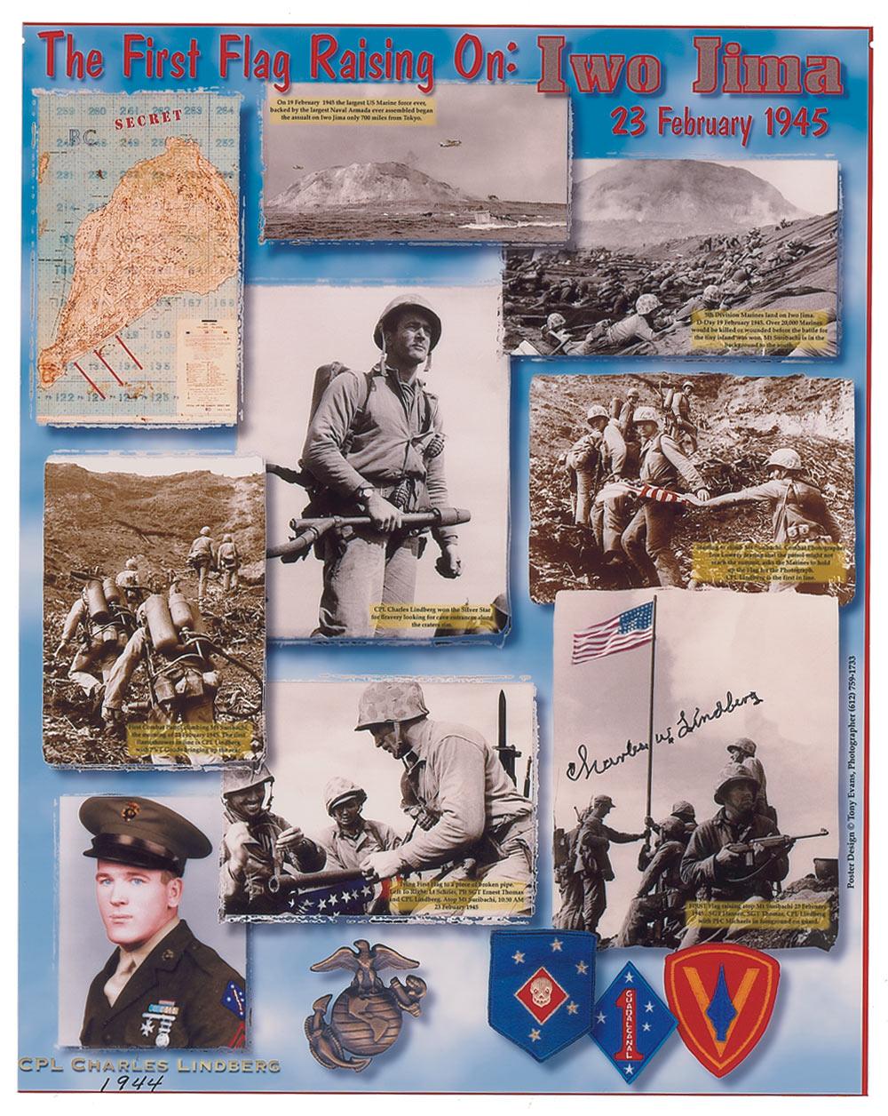Color satin-finish 8 x 10 composite photo of the assault on Iwo Jima and the first flag-raising, signed in black felt tip by Lindberg, adding “1944,” at the bottom of the photo. In very fine condition.