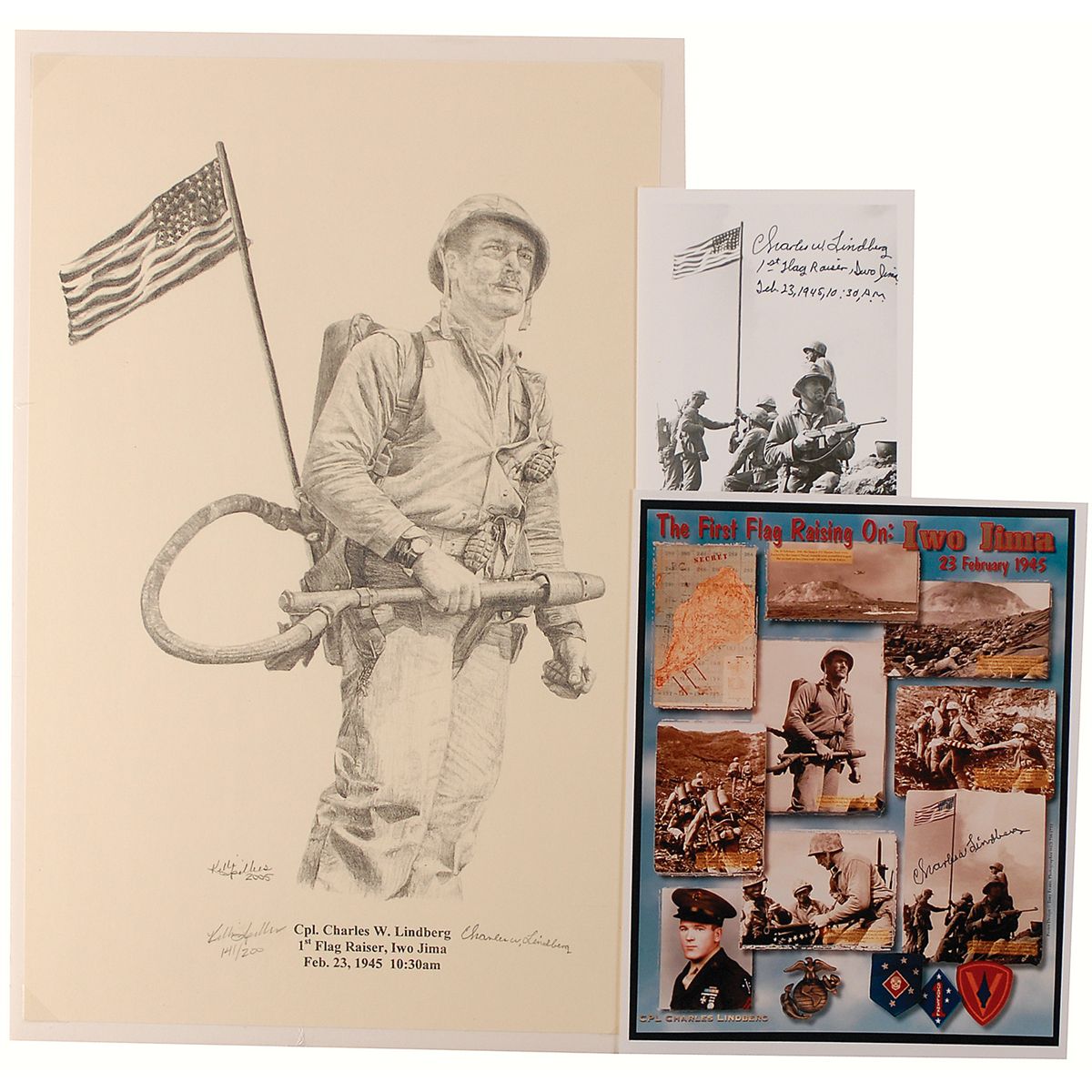 Three items: satin-finish 5 x 7 of the first flag raising, signed in black felt tip; color satin-finish composite photo of Lindberg and Iwo Jima, signed in black felt tip; and a limited edition 11 x 17 print of Lindberg, signed in pencil, and also signed in pencil by the artist. In fine condition.