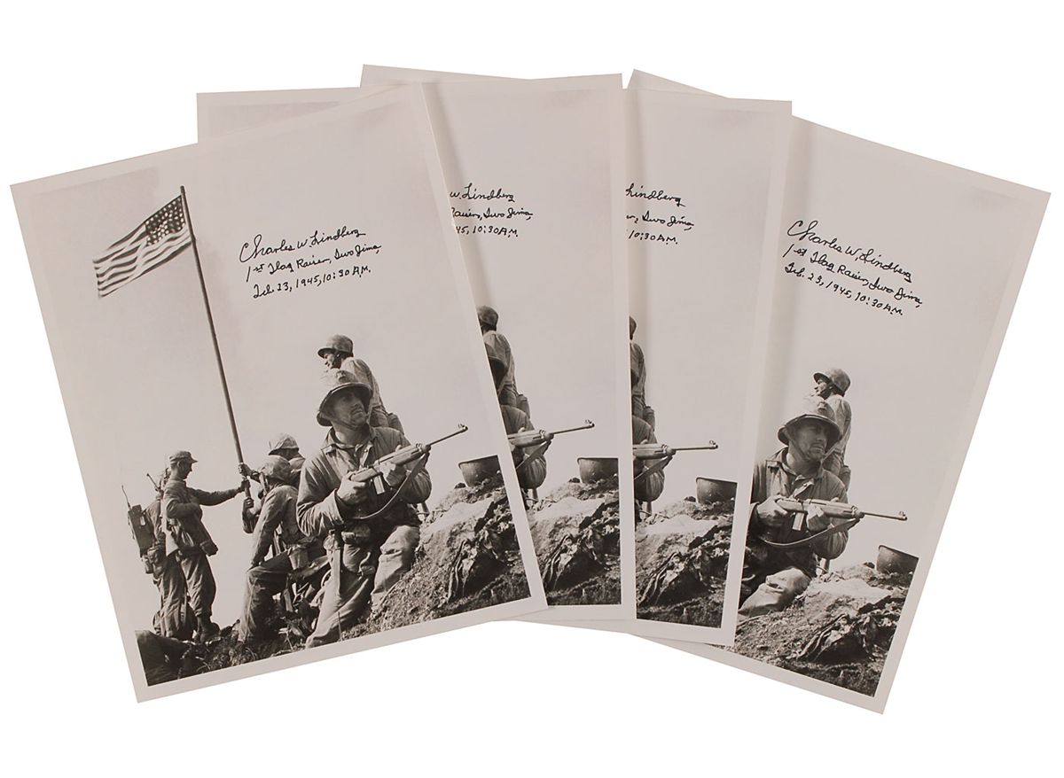 Four identical satin-finish 8 x 10 photos from the flag raising at Iwo Jima, each signed in black felt tip, “Charles W. Lindberg, 1st Flag Raiser, Iwo Jima, Feb. 23, 1945, 10:30 A. M.” In overall very fine condition.