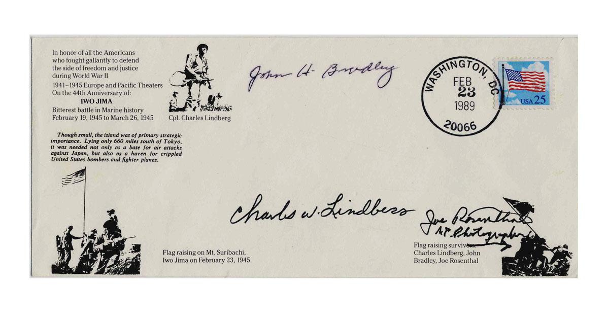 Iwo Jima's 44th anniversary first day cover signed by Joe Rosenthal, John Bradley and Charles Lindberg. Envelope measuring 9'' x 4'' is in fine condition.