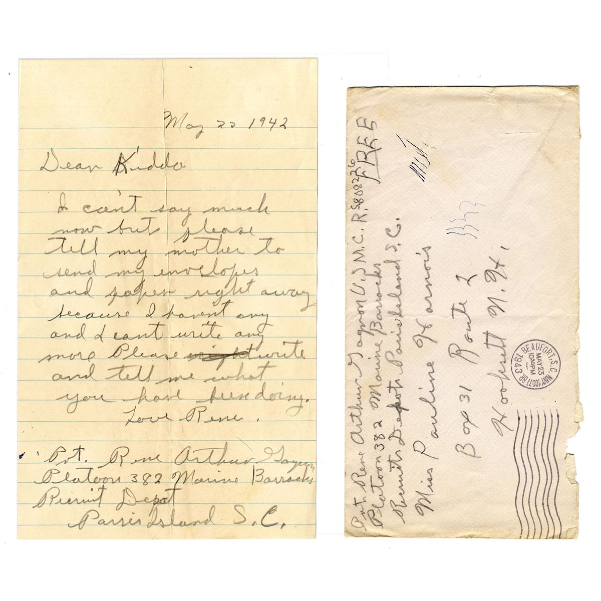 WWII Iwo Jima hero Rene Gagnon autograph letter signed as a Private First Class in the US Marine Corps, dated 22 May 1942. Gagnon was stationed at training camp on Parris Island, South Carolina. Gagnon was one of the six WWII soldiers elevated to icon status after appearing in the famous photograph ''Raising The Flag on Iwo Jima.'' Only three of the six soldiers in the photo survived the hard-fought Battle of Iwo Jima, and the remaining men were reportedly plagued with survivor's guilt, including Gagnon. Letter is addressed to his love back home, Pauline Harnois. Brief letter reads in full: ''Dear Kiddo, I can't say much now but please tell my mother to send envelopes and paper right away because I haven't any more. Please write and tell me what you have been doing. Love Rene''. He then additionally signs his full name ''Pvt. Rene Arthur Gagnon'' and his stationing address beneath signature. Letter on 1pp. measures 5'' x 8'' and is in very good condition. Includes original postmarked envelope addressed in Gagnon's hand, including his full name and return address.