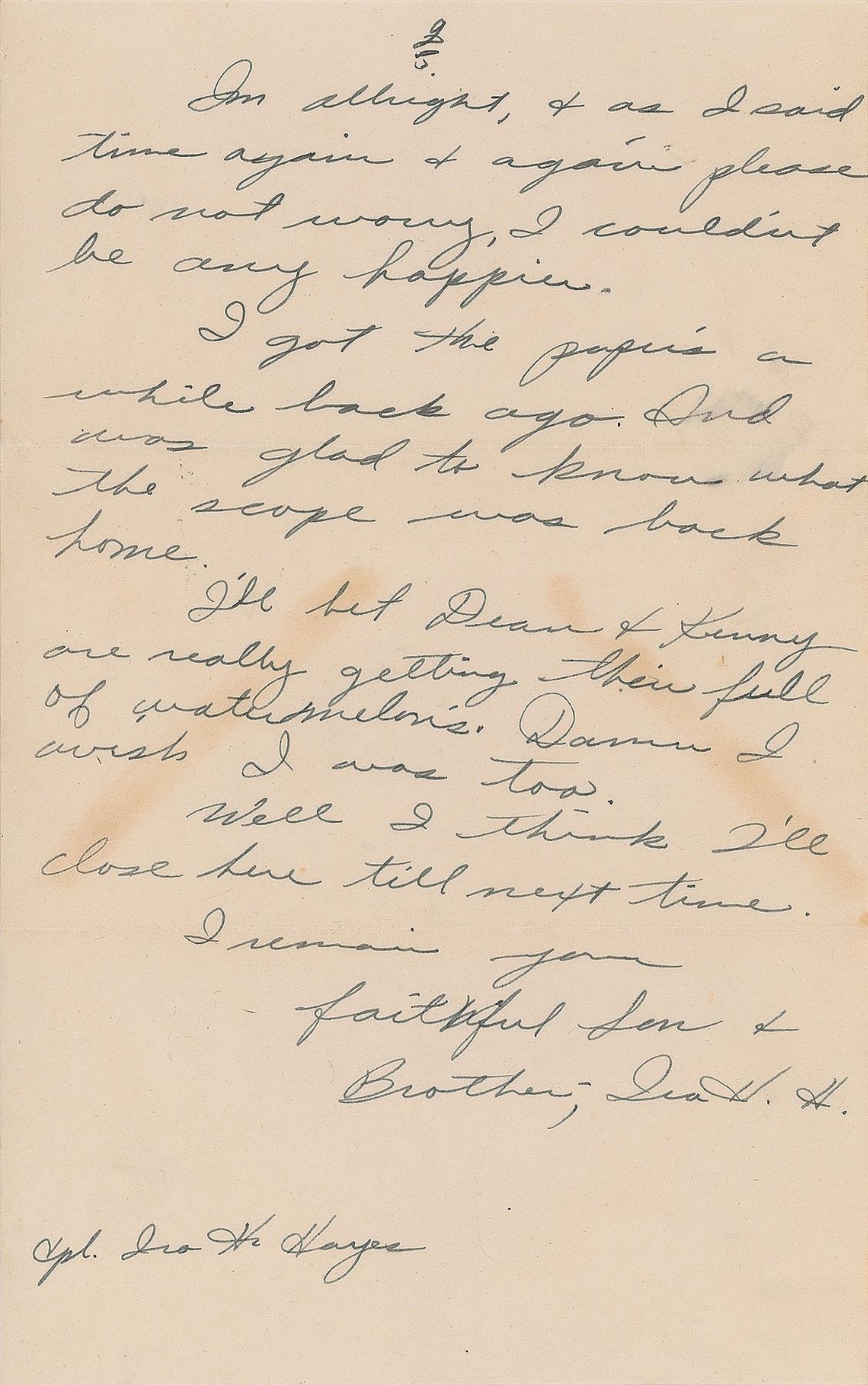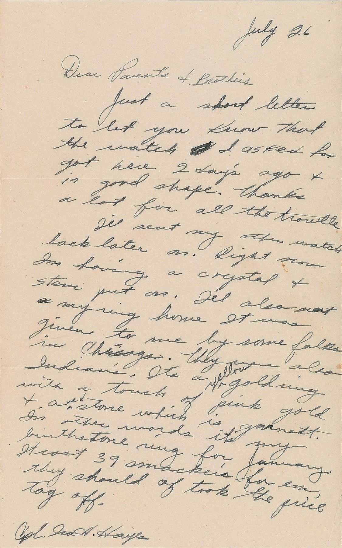 ALS signed "Ira H. H.," two pages, 6.25 x 10, July 26, no year. Letter to his parents and brothers, in full (spelling and grammar retained): “Just a short letter to let you know that the watch I asked for got here 2 day’s ago & in good shape. Thanks a lot for all the trouble. I’ll sent my other watch back later on. Right now I’m having a crystal & stem put on. I’ll also sent my ring home It was given to me by some folks in Chicago. They were also Indian’s. Its a yellow gold ring with a touch of pink gold & a red stone which is garnett. In other words it’s my birthstone ring for January. It cost 39 smacker’s for em, they should of took the price tag off. Im allright, & as I said time again & again please do not worry, I couldn’t be any happier. I got the paper’s a while back ago. And was glad to know what the scope was back home. I’ll bet Dean & Kenny are really getting their full of watermelon’s. Damn I wish I was too. Well I think I’ll close here till next time.” Hayes signs his name in the lower left corner of both pages, “Cpl. Ira H. Hayes.” In fine condition.