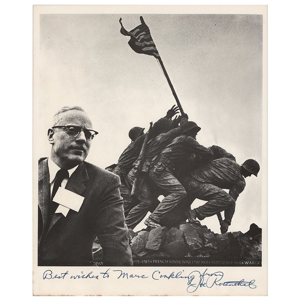 Vintage matte-finish 8 x 10 photo of Rosenthal posing next to the Marine Corps War Memorial in Arlington County, Virginia, signed and inscribed in the lower border in black ballpoint, "Best wishes to Marc Conkling, from Joe Rosenthal.†In fine condition.