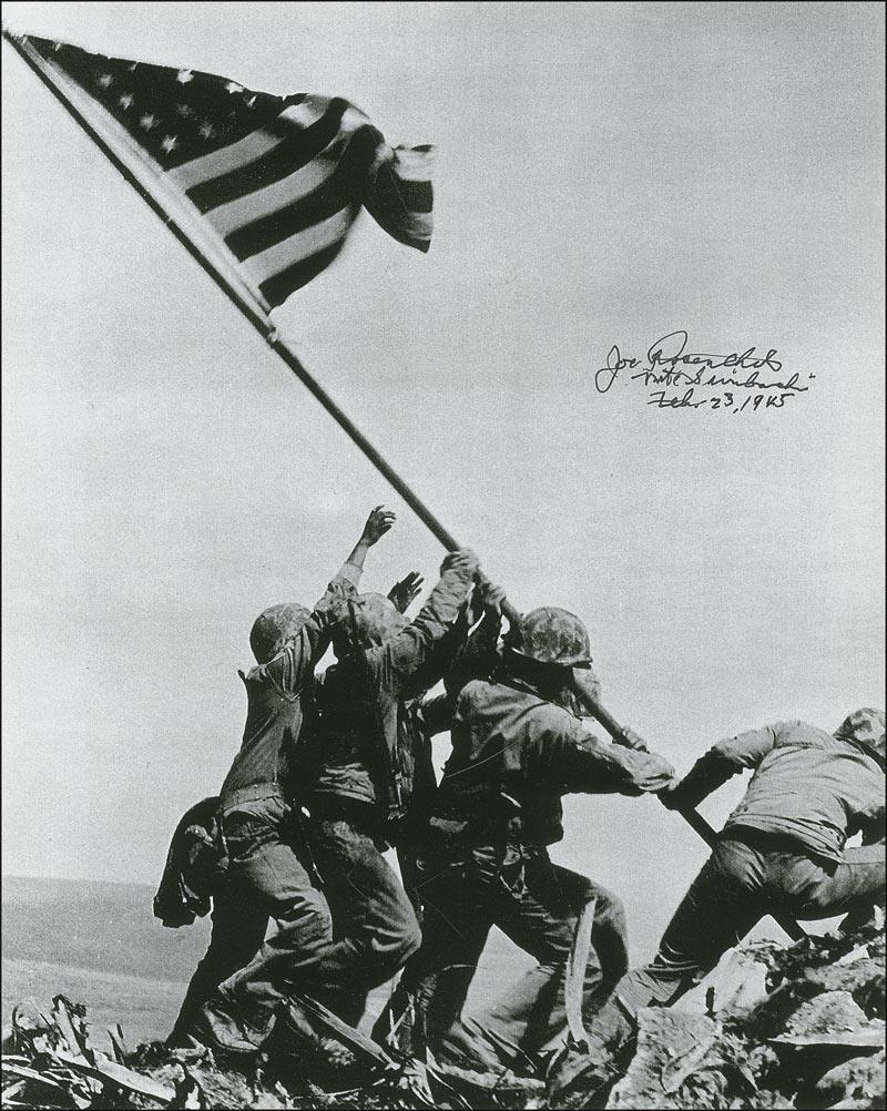 Famous 10 x 12.75 lightweight cardstock photo of the flag raising on Mount Suribachi after the battle of Iwo Jima, signed in black felt tip, “Joe Rosenthal, Mt. Suribachi, February 23, 1945.” In fine condition. Accompanied by an unsigned typescript copy of the story of the photograph, as told by Rosenthal, titled The Picture That Will Live Forever. Uncommon in this size.