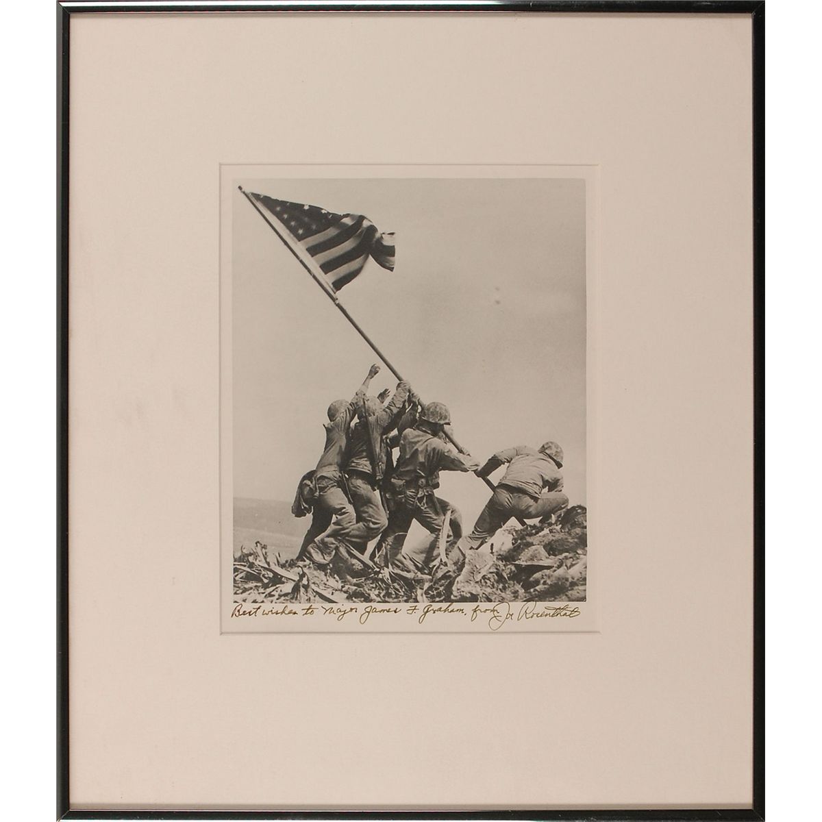 Iconic matte-finish 7 x 8.75 photo of the Iwo Jima flag raising, signed and inscribed in the lower border in black felt tip, “Best wishes to Major James F. Graham, from Joe Rosenthal.” Matted and framed to an overall size of 13.5 x 15.5. A light crease to the lower right (slightly affecting the signature), and some trivial irregular ink adhesion, otherwise fine condition.