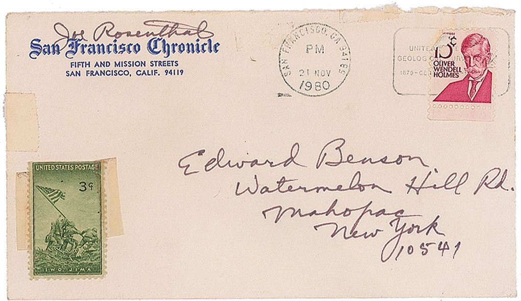 Felt tip signature and inscription, “Best wishes to Marine Edward Benson, from Joe Rosenthal,” on an off-white 5.5 x 3.5 card. In fine condition, with a small piece of tape affixed to the lower right. Accompanied by the original mailing envelope, filled out in Rosenthal’s hand, including his signature in the return address area.