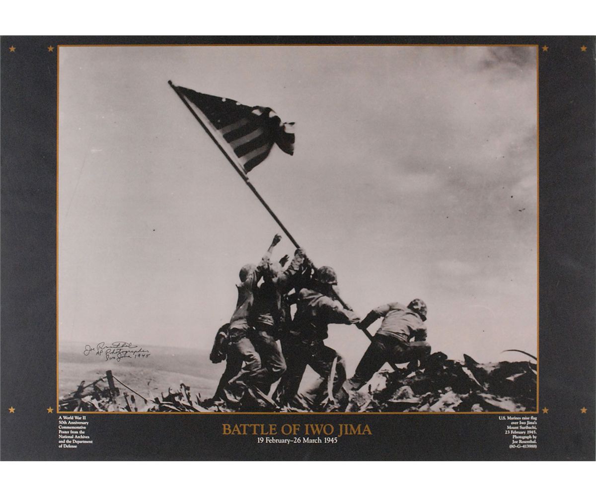 Color 28 x 20 poster of the classic image entitled ‘Battle of Iwo Jima,’ signed in black felt tip, “Joe Rosenthal, AP Photographer, Iwo Jima 1945.” Rolled and in fine condition.