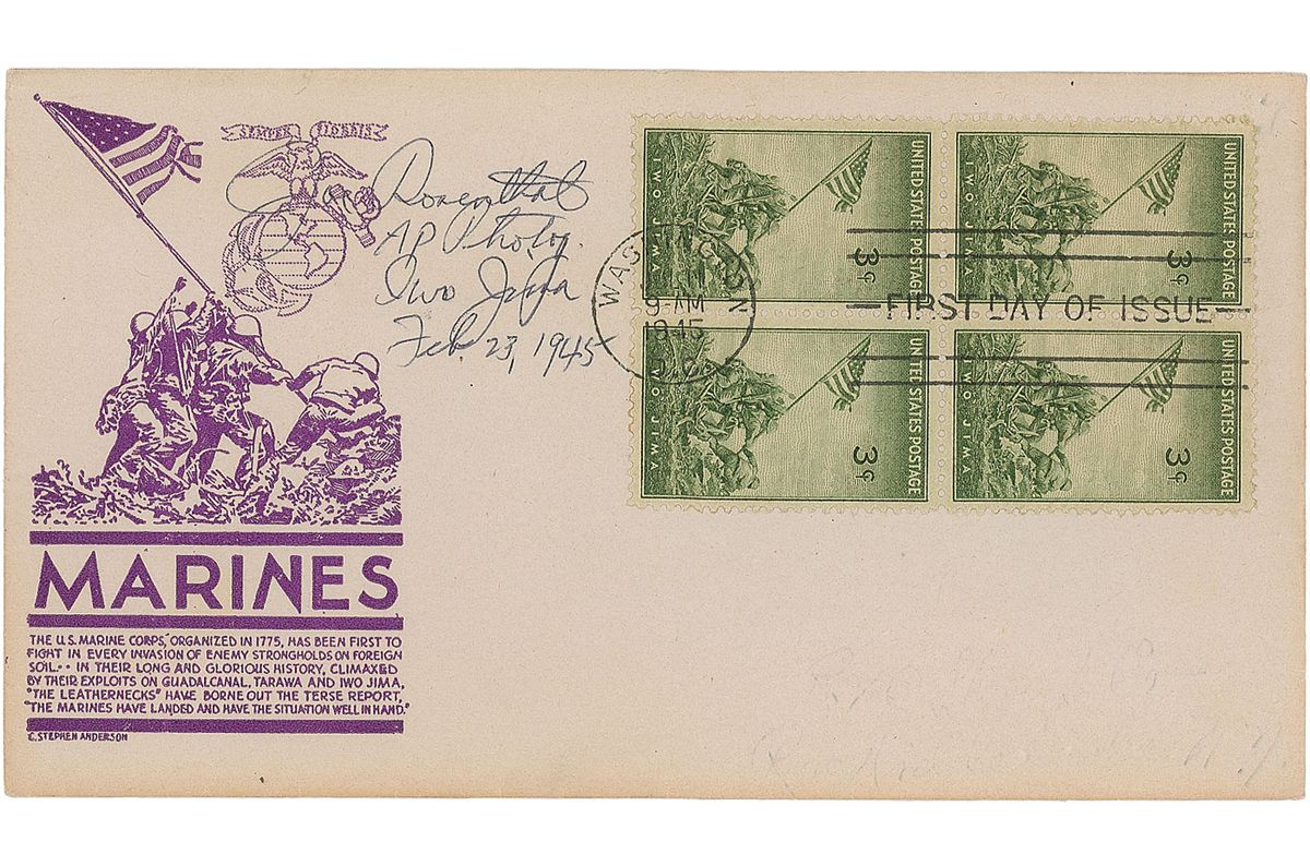 FDC with a cachet honoring the Marines, with four Iwo Jima postage stamps, signed in ballpoint, “Rosenthal, AP Photog., Iwo Jima, Feb, 23, 1945.” In fine condition, with indentations from a removed pencil address to lower right.