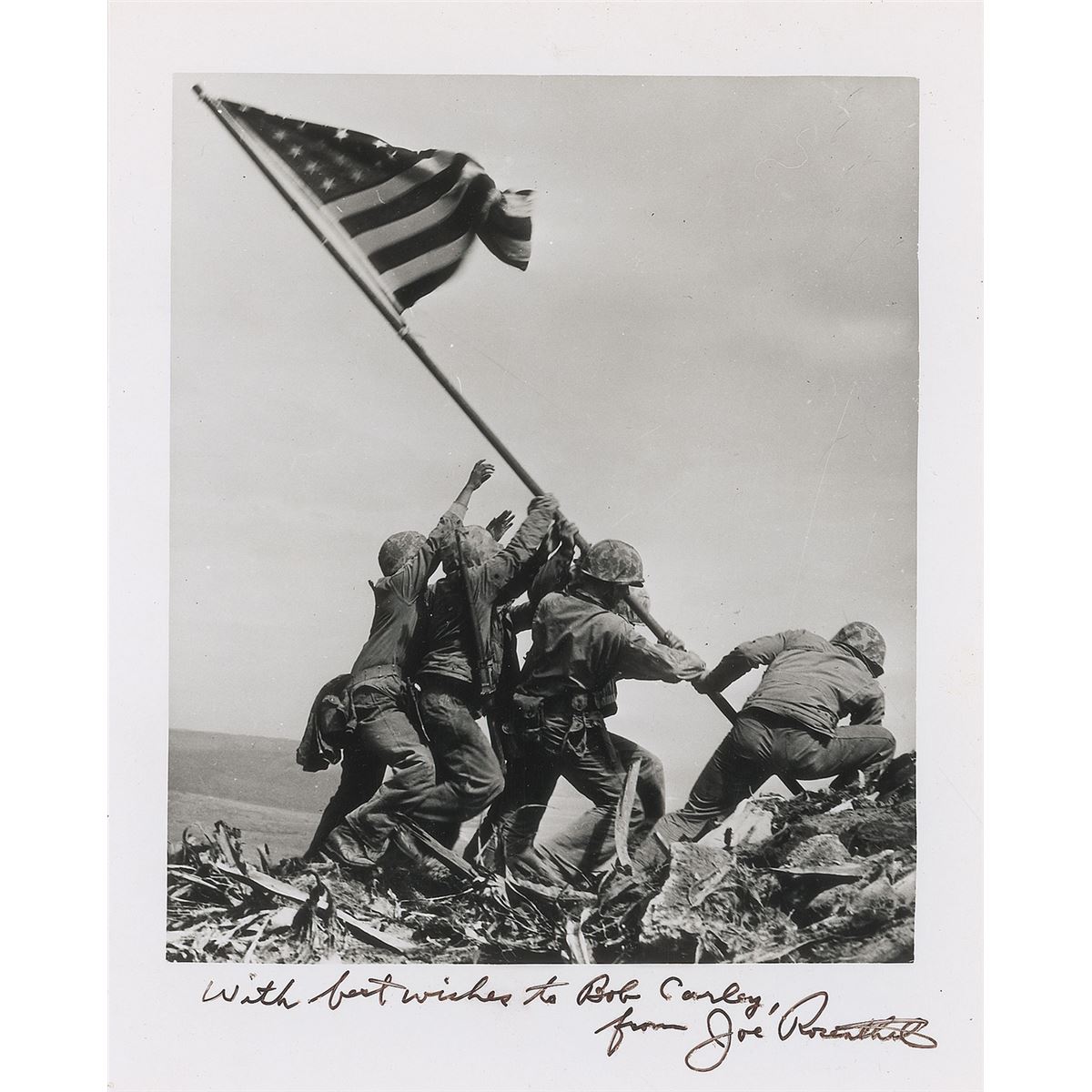 Glossy 8 x 10 photo of the flag-raising on Iwo Jima, signed and inscribed in black felt tip, “With best wishes to Bob Curley, from Joe Rosenthal.” A trimmed left edge and some irregular adhesion and brushing to the signature and inscription, otherwise fine condition.